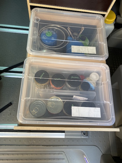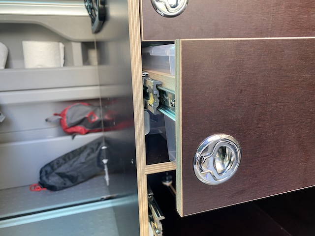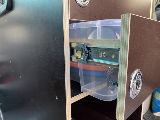 Heute bin ich froh, den etwas aufwendigeren Weg gegangen zu sein: Rahmen zu bauen, in die die SAMLA-Boxen eingesetzt und wieder herausgenommen werden können, und diese Rahmen auf Auszugschienen zu montieren. Das ist sowohl beim Beladen des Busses als auch beim Reinigen der Schubkästen sehr angenehm.