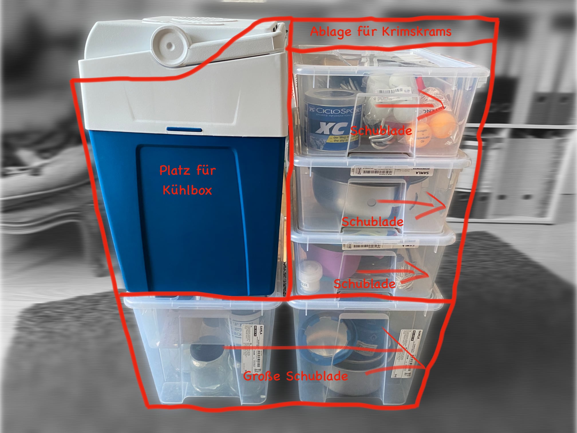 „eine große und zwei kleine SAMLA-Boxen und daneben die Kühlbox, Spanngurt drum und fertig“
